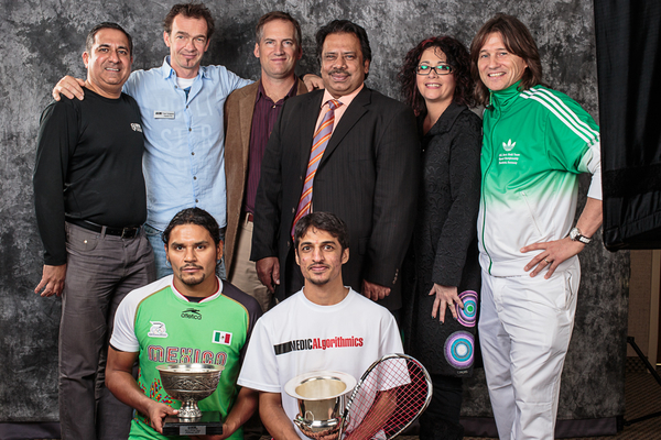 Zaman, kneeling right, and Galvez are pictured with (standing) Franz Schwerer (Tournament Director), Tuey Connell, Anil Gidwaney (Sponsor), Jahangir Khan, Danielle Maur (National Squash Director for Life Time Fitness) and Andre Maur.